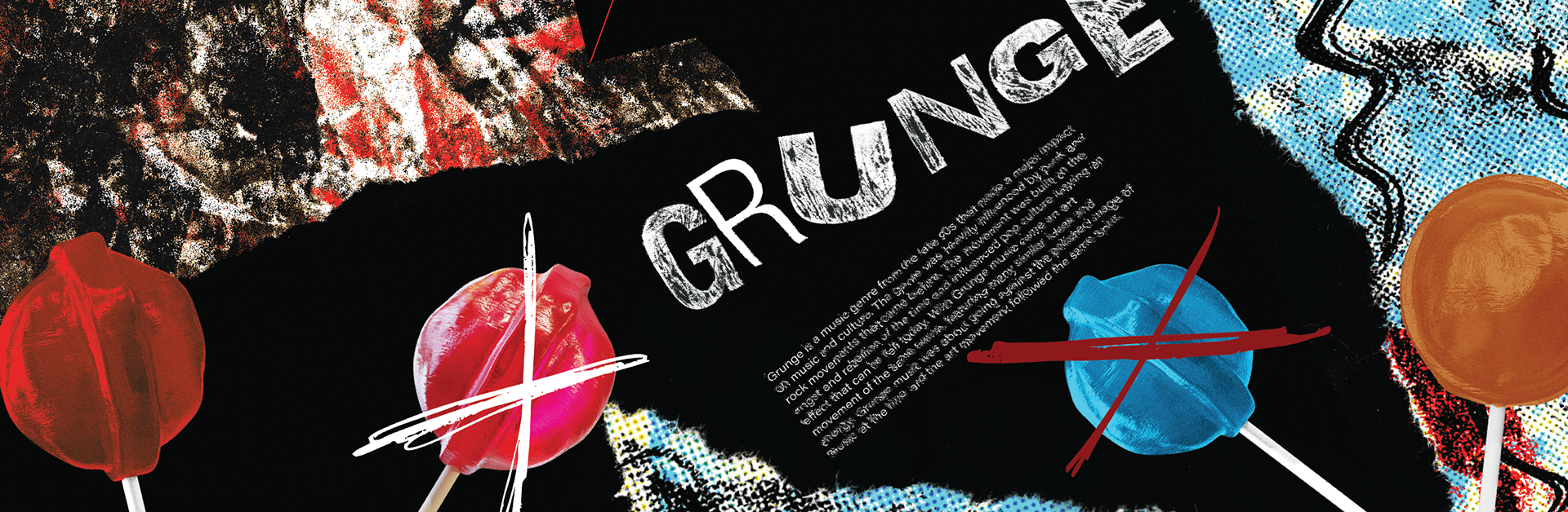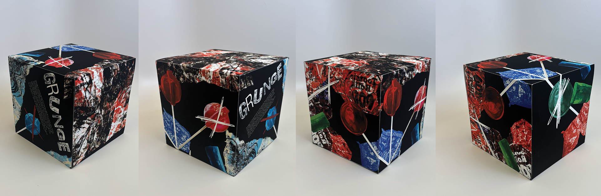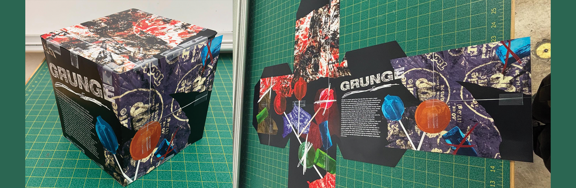The prompt for this project was to develop a cube based on a specific design movement. The first step of the project was research, which culminated in a short research paper that would later be used on the cube. The subject I chose was Grunge, an art movement from the late 90s that emphasized rough textures and bold colors